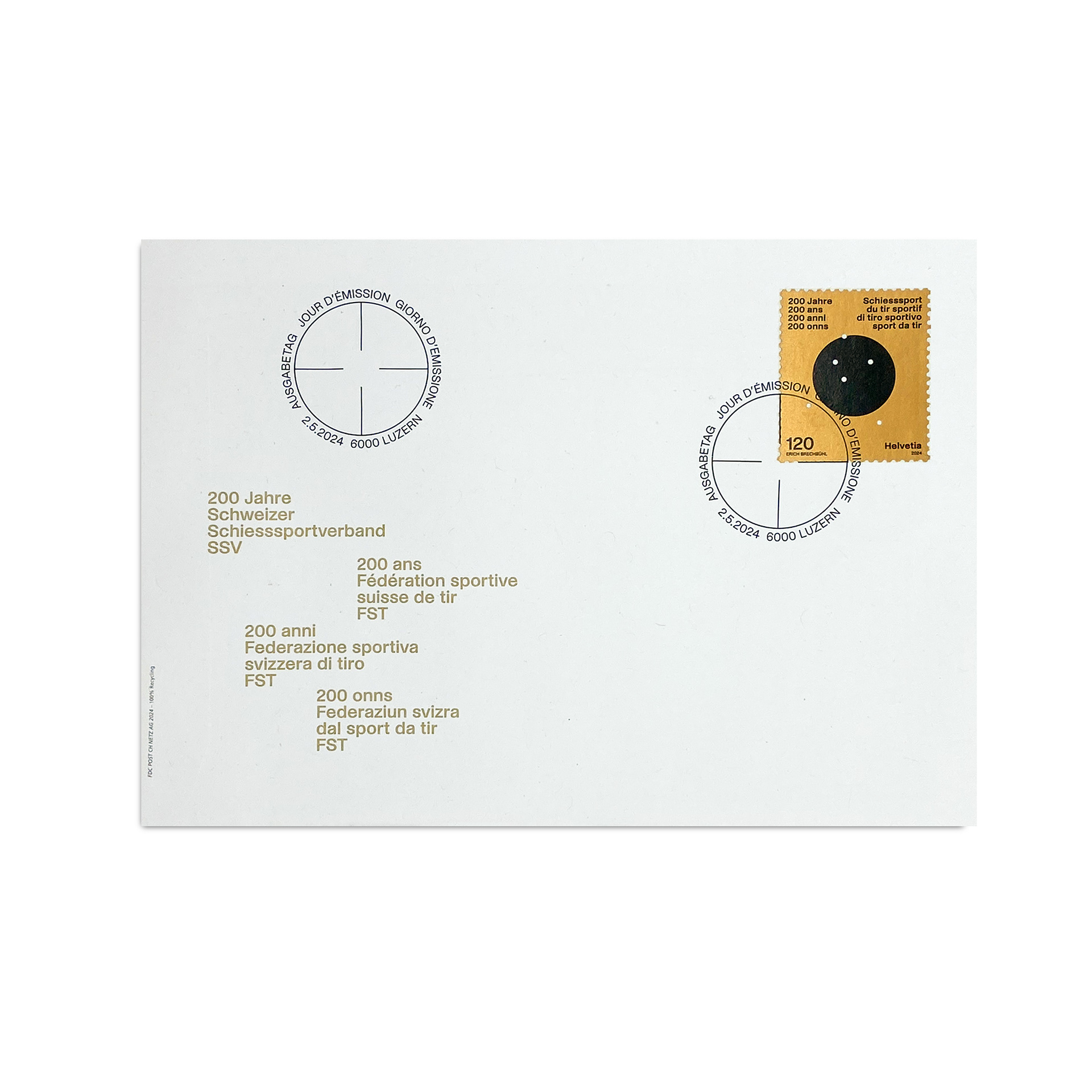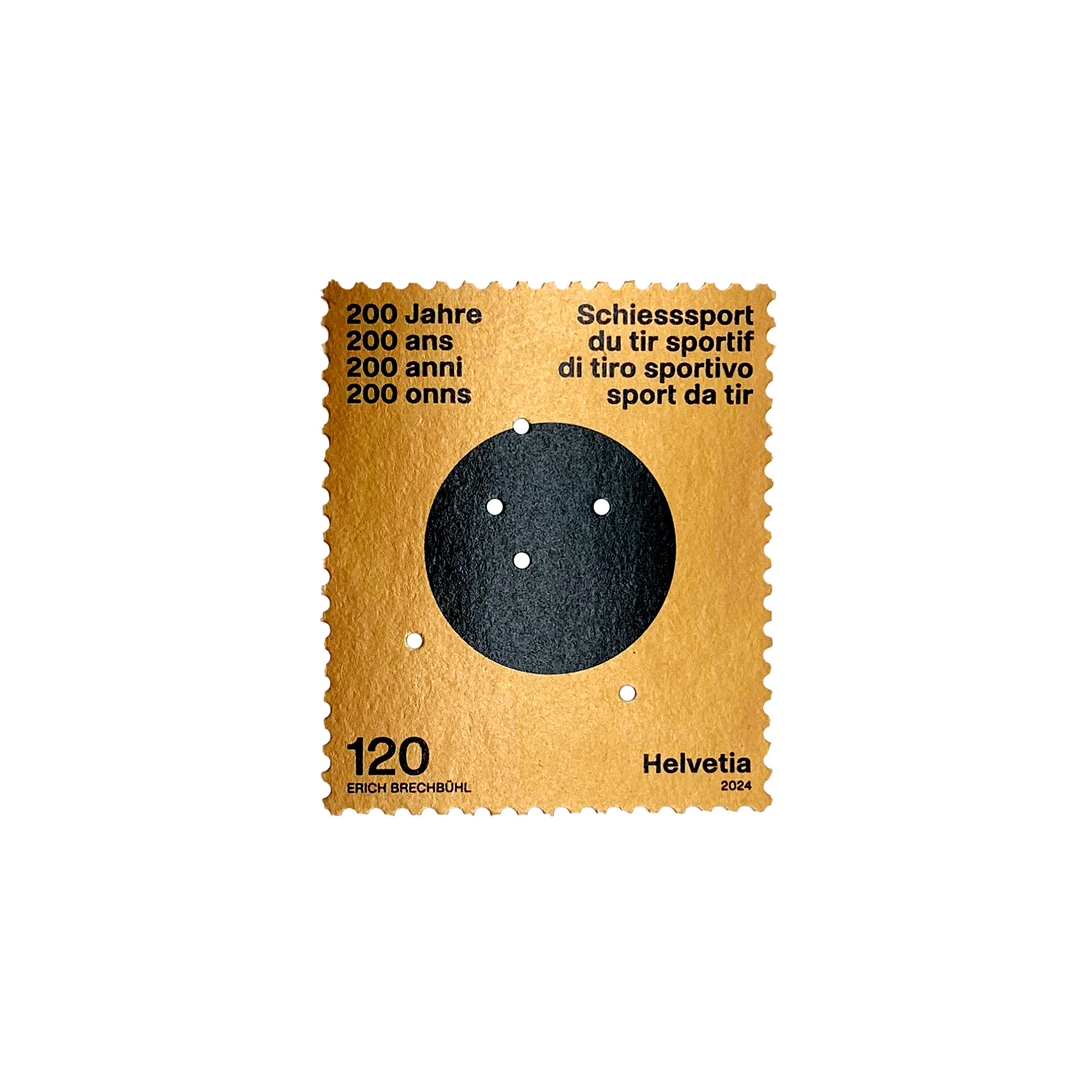 Official stamp celebrating the 200th anniversary of the Swiss Shooting Sport Federation. Printed with gold and punched holes.