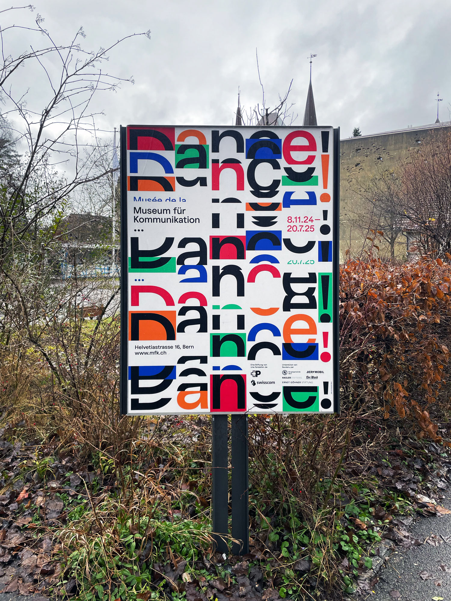 Poster for an exhibition on the various forms of dance at the Museum for Communication in Berne. At the club, on stage, when creating TikTok content or cooking a meal: if we hear a song we like, we all begin to dance! Sometimes we barely notice, but other times the feeling is so intense that we are oblivious to the world around us. But why do we actually dance? What is it that causes red faces, that attracts, irritates or thrills us when we see people dancing? The exhibition DANCE! will invite us to immerse ourselves in a world of rhythmical movement and allow ourselves to get carried away. Printed in five spot colours. Animation: Josh Schaub