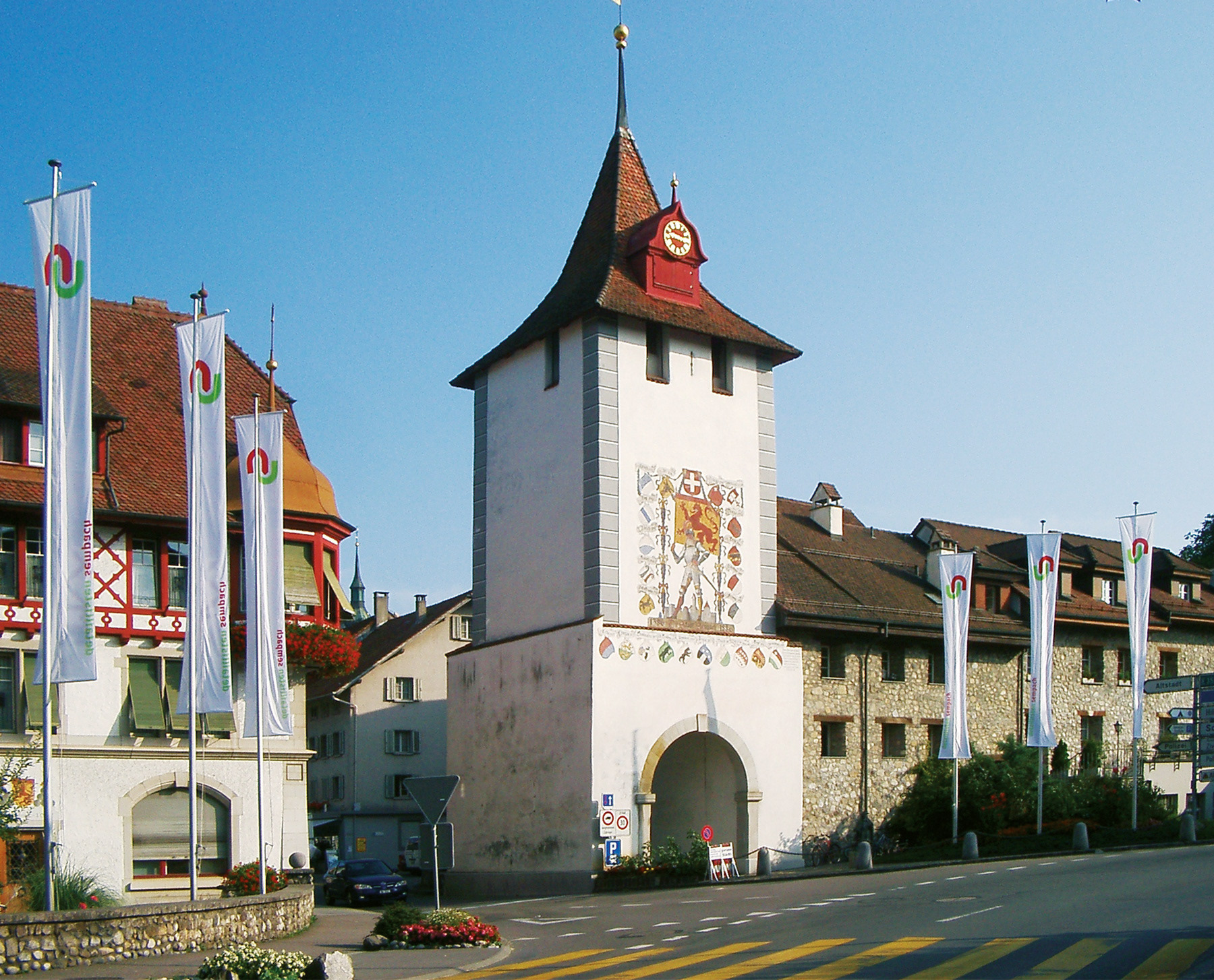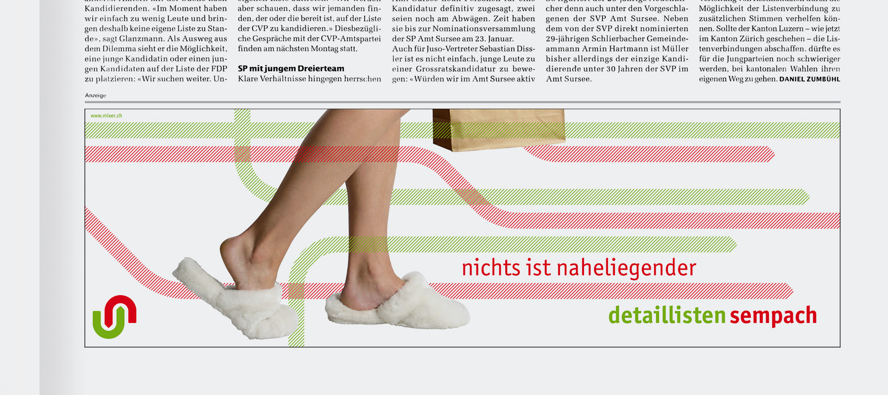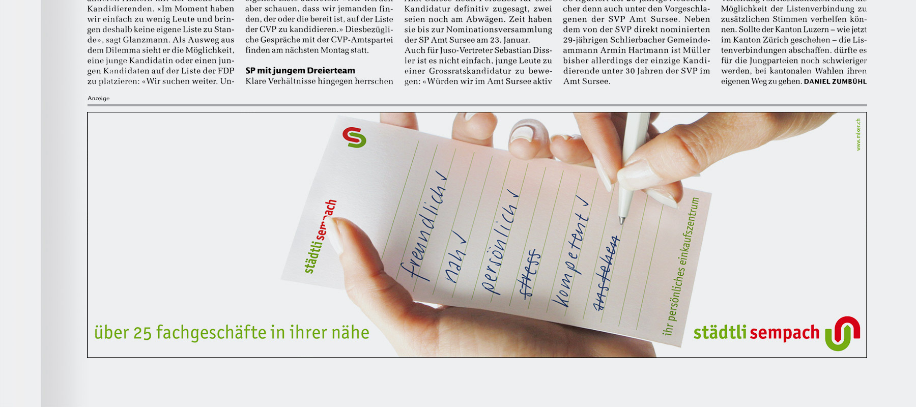 Corporate design for the retail federation of Sempach. The design shows in an abstract way the two gates of Sempach. With the consistency of the design, the retailers show that they belong together.