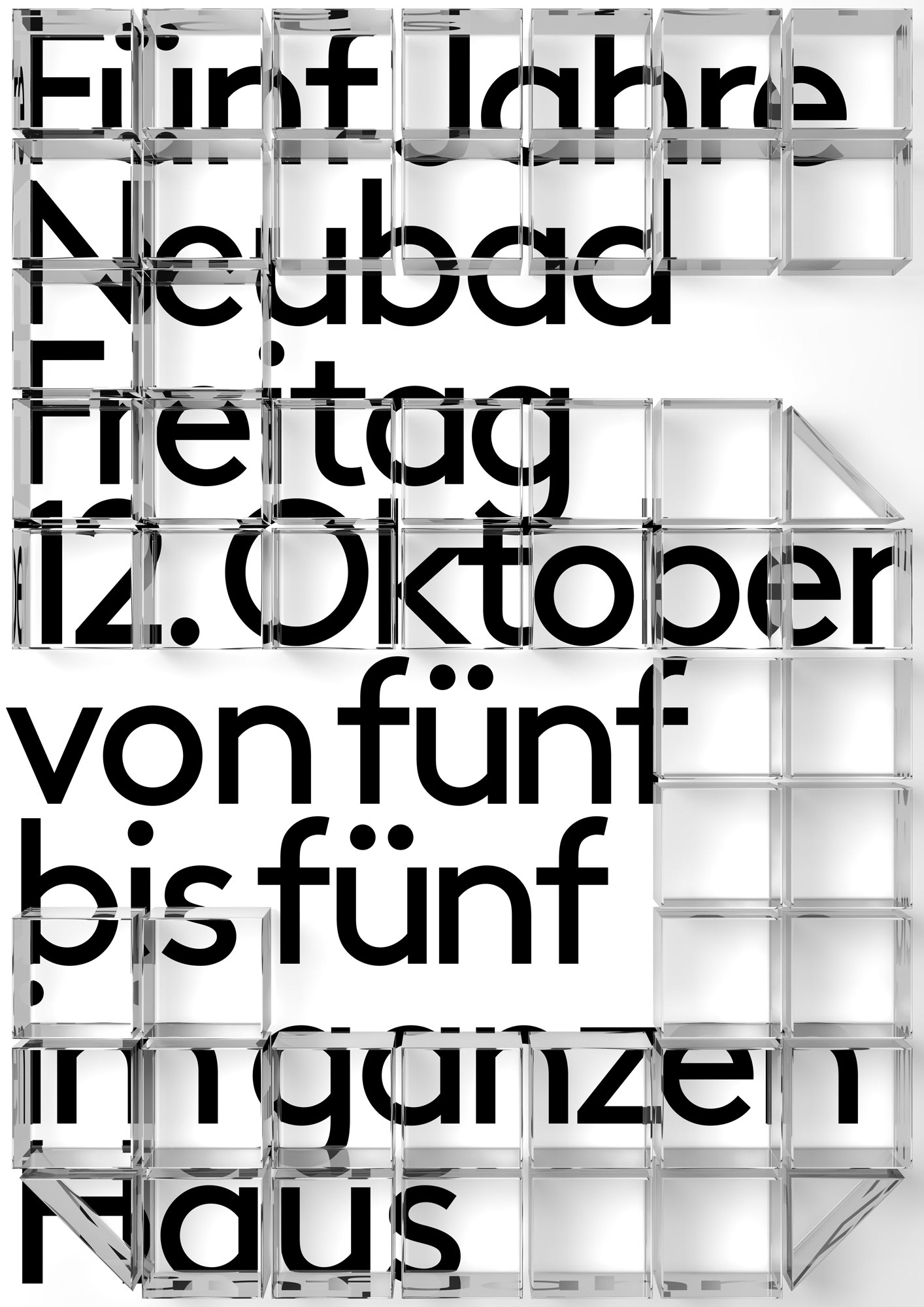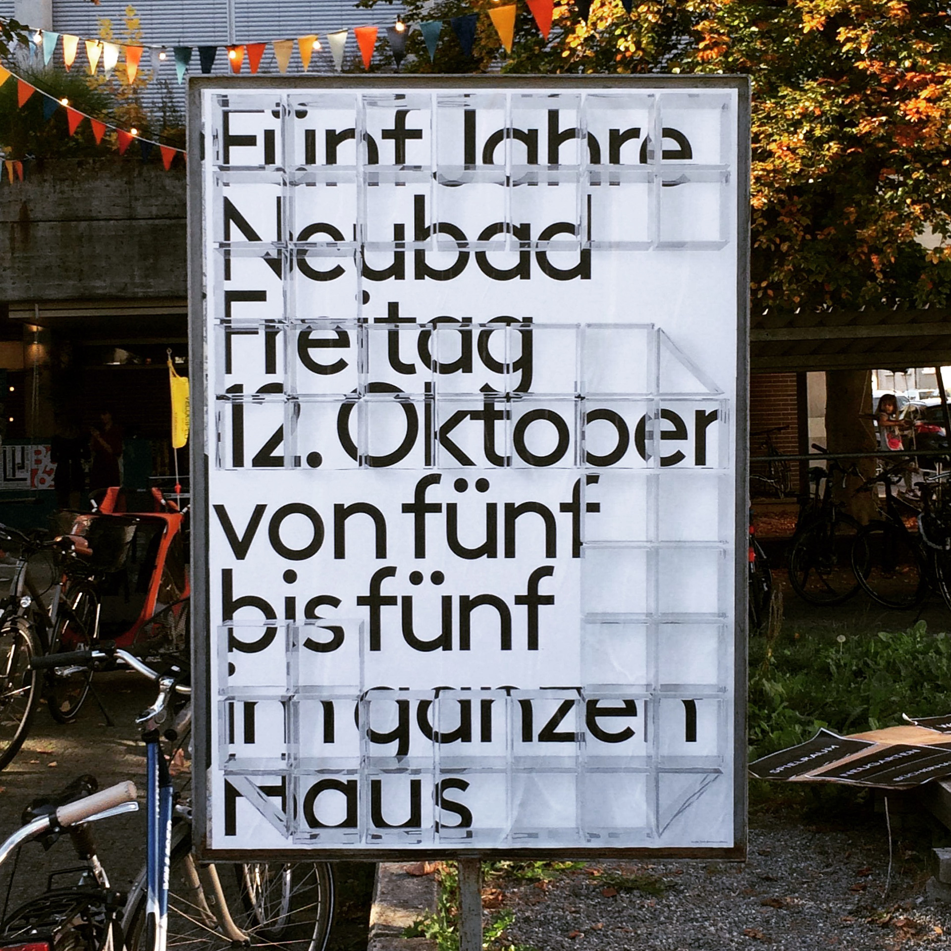 Poster for the five year anniversary of the cultural interim use of the old municipal indoor swimming pool of the city of Lucerne