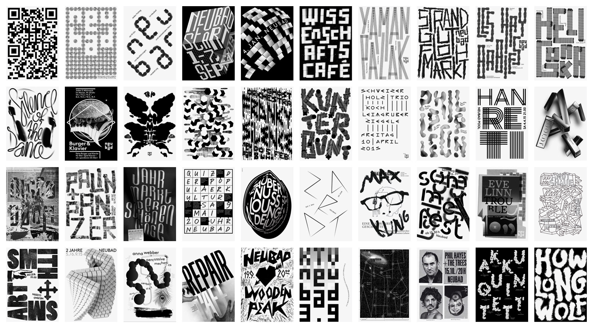Posters by various graphic designers from Lucerne, who support Neubad with their voluntary work.