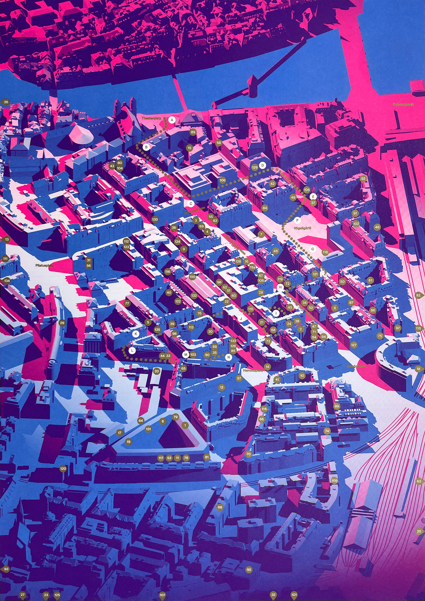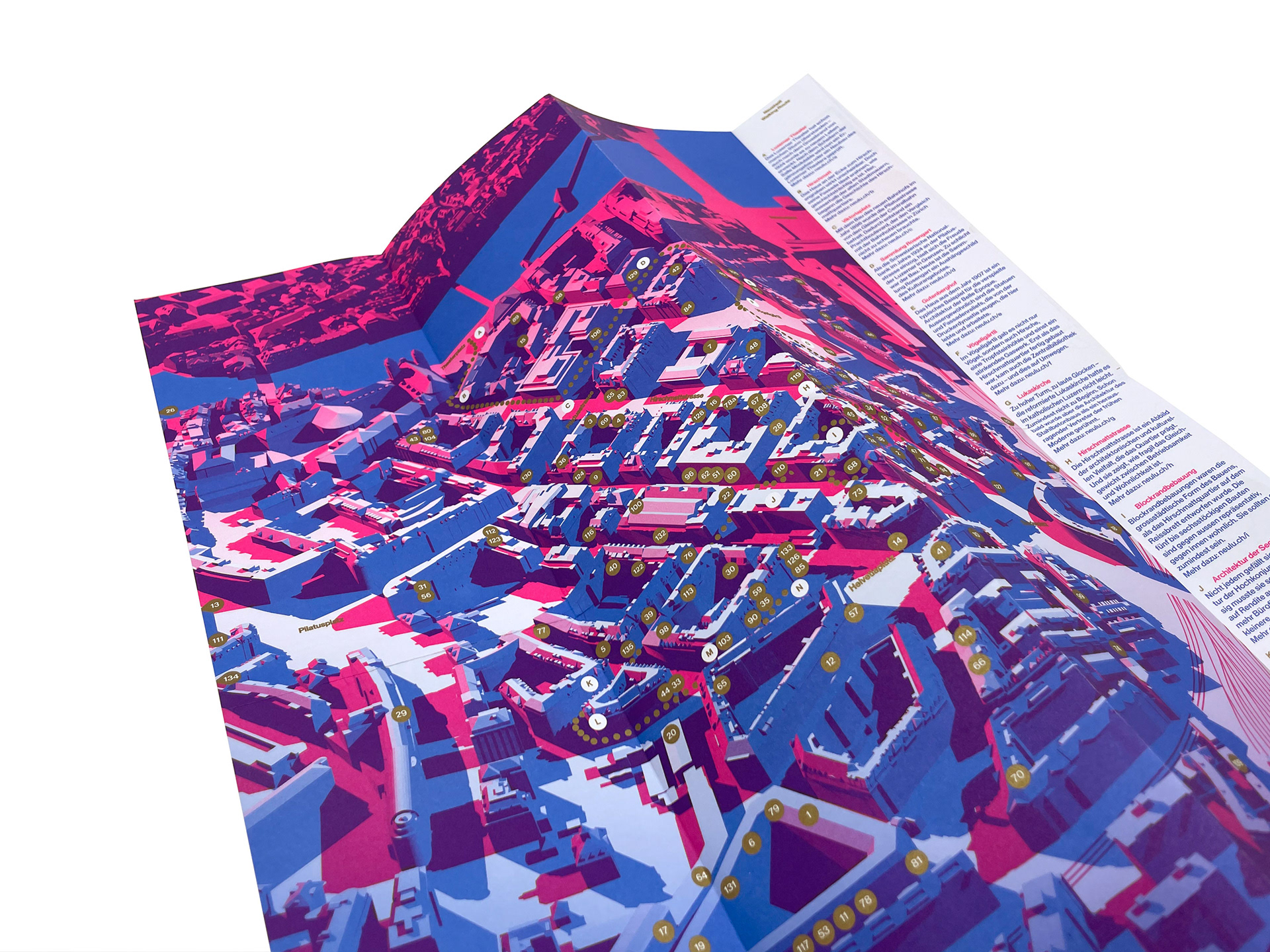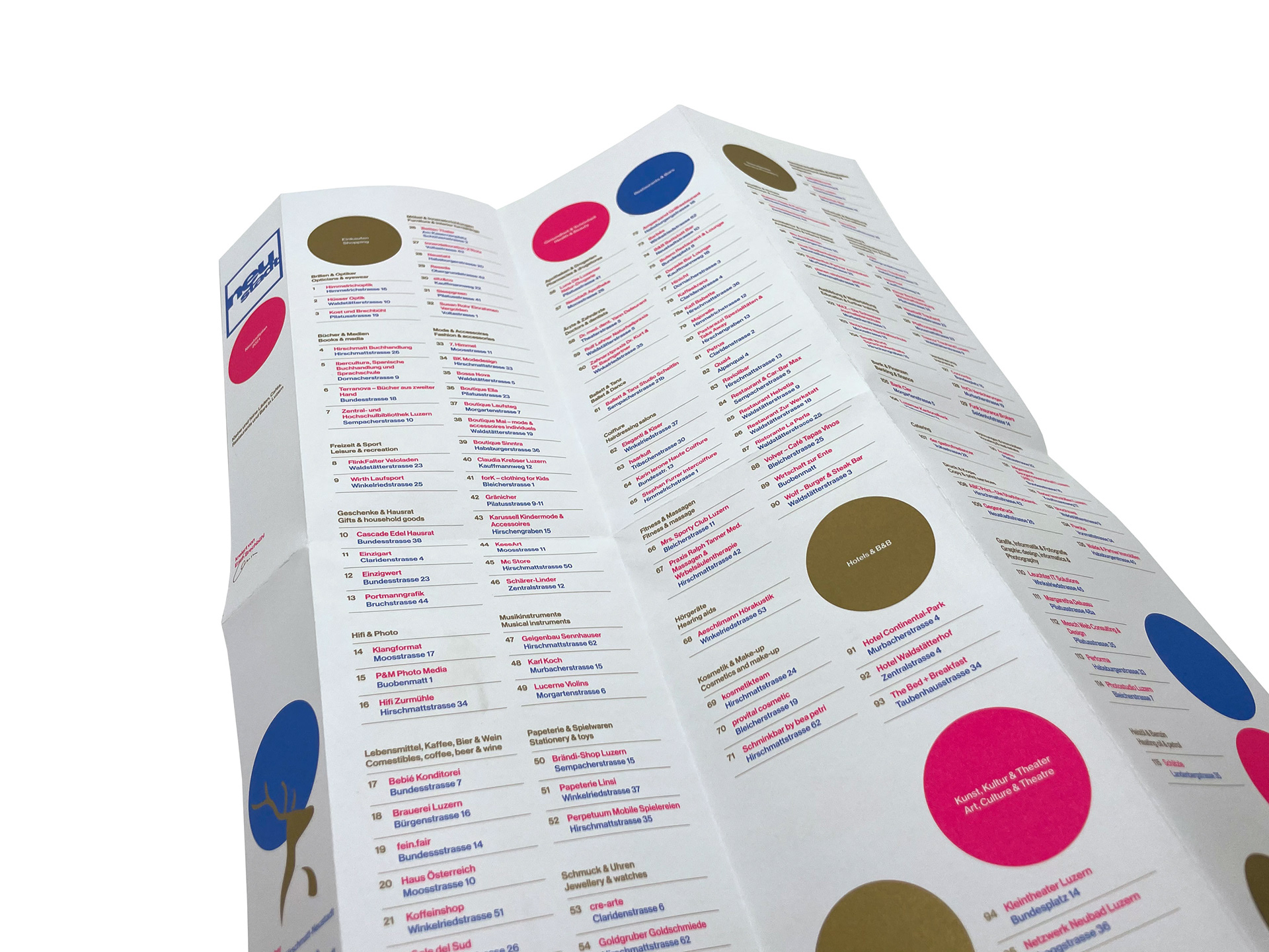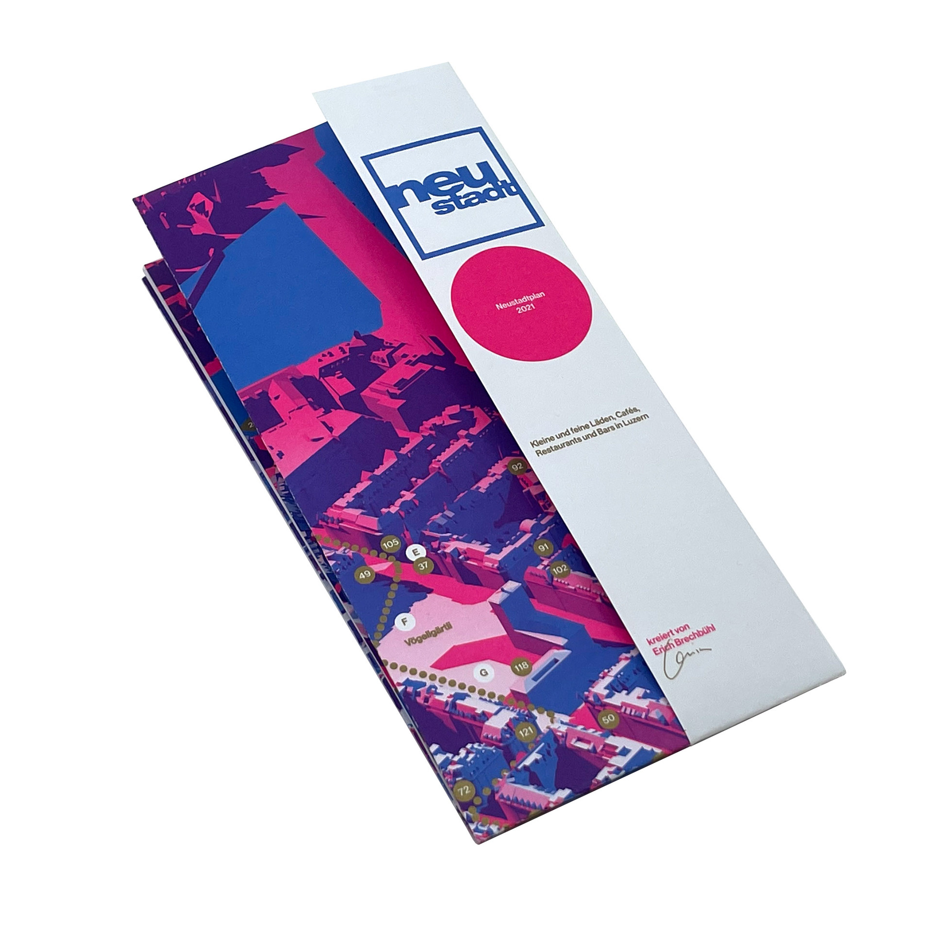 General map of Lucerne's Neustadt district showing small and fine shops, cafés, restaurants and bars. Printed in 3 spot colours: Neon Pink, Blue and Gold