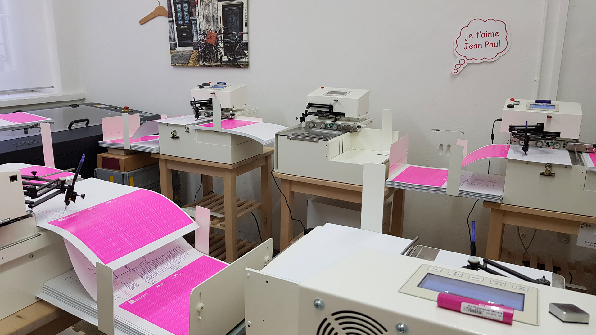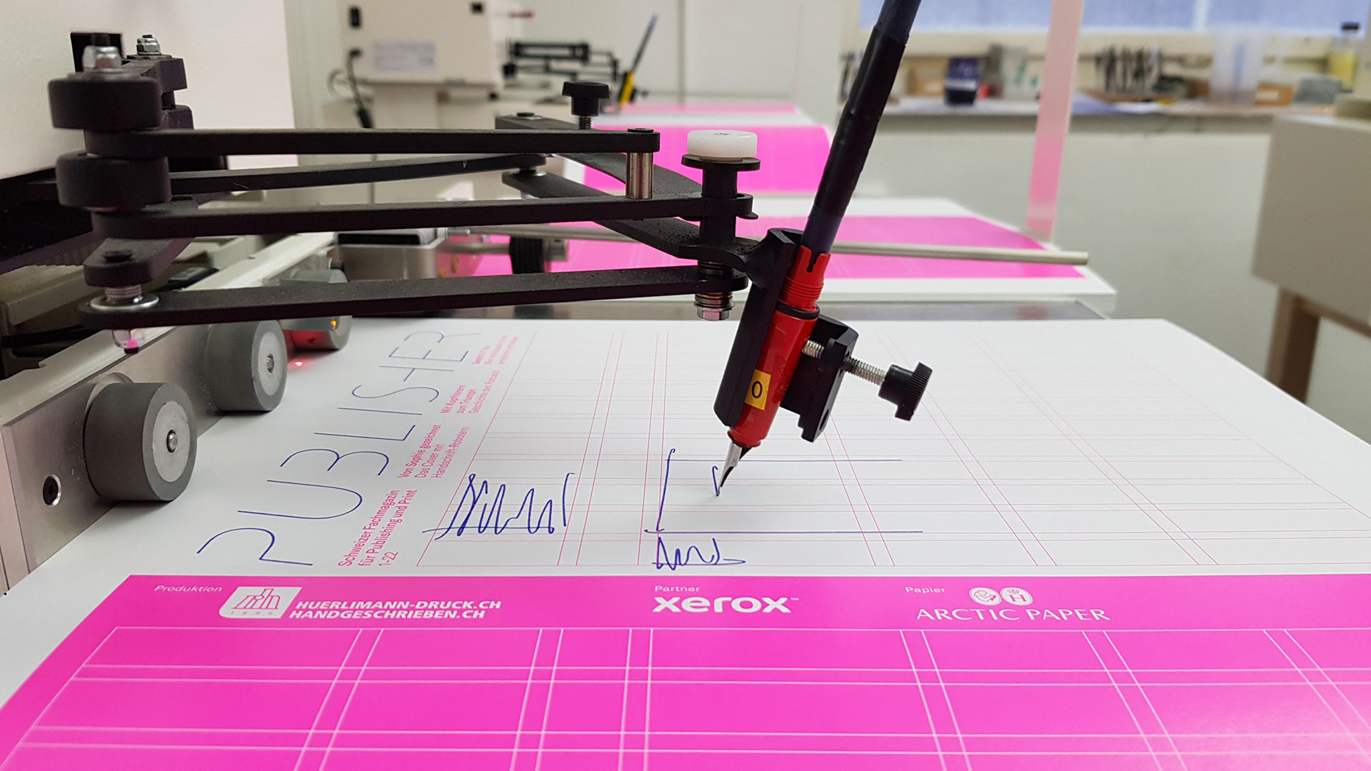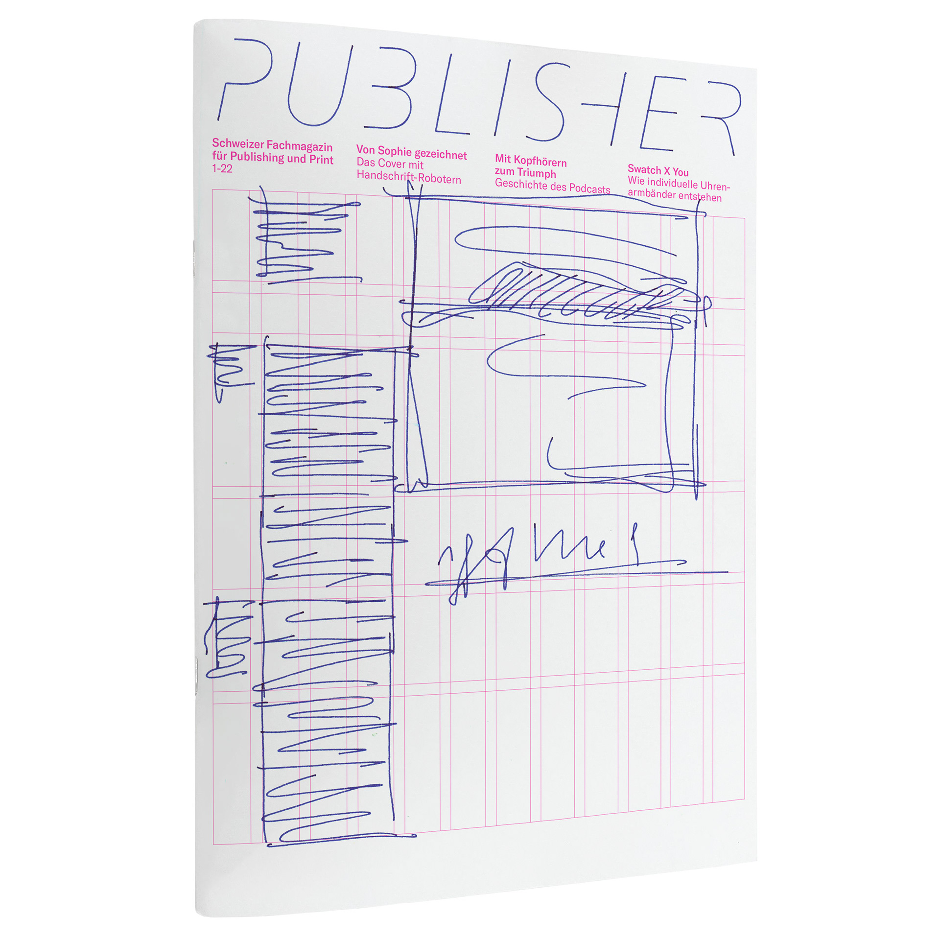 Cover for the leading Swiss trade journal for publishing and digital printing. "Printed" with hand writing robots at Druckerei Hürlimann and digital neon pink with Xerox.
