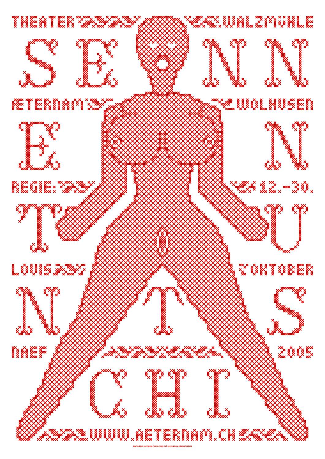 Jury review Swiss Poster Award: "Gold in the Culture Category goes to 'Sennentuntschi'. The jury was swayed by the surprising juxtaposition of traditional embroidery and provocative symbolism. The combination is all the more ingenious in that it deals with a subject some would rather sweep under the carpet."