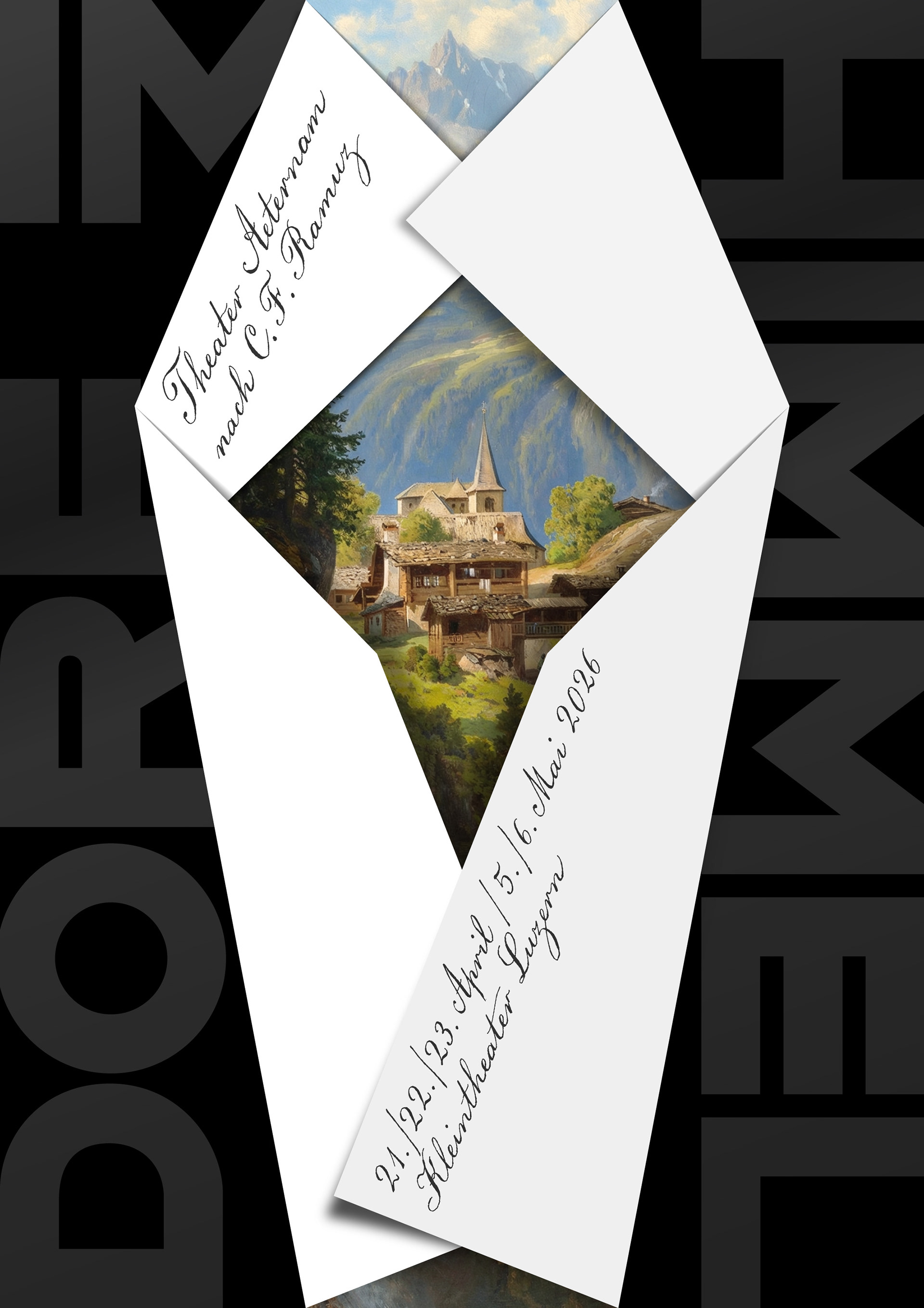 Poster & moving poster for the play "Dorf im Himmel" by Theater Aeternam, based on the novel by C.F. Ramuz. The central image is based on Adolf Mosengel's "Dorf in den Berner Alpen", 1885.