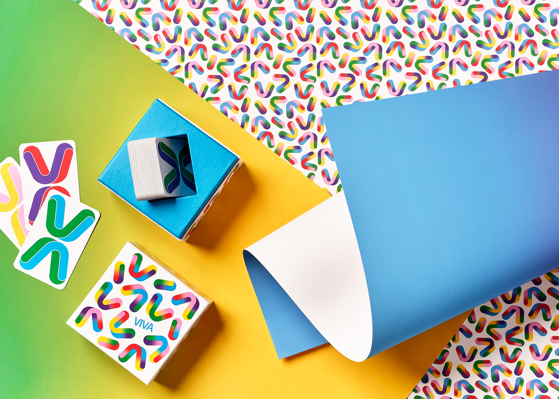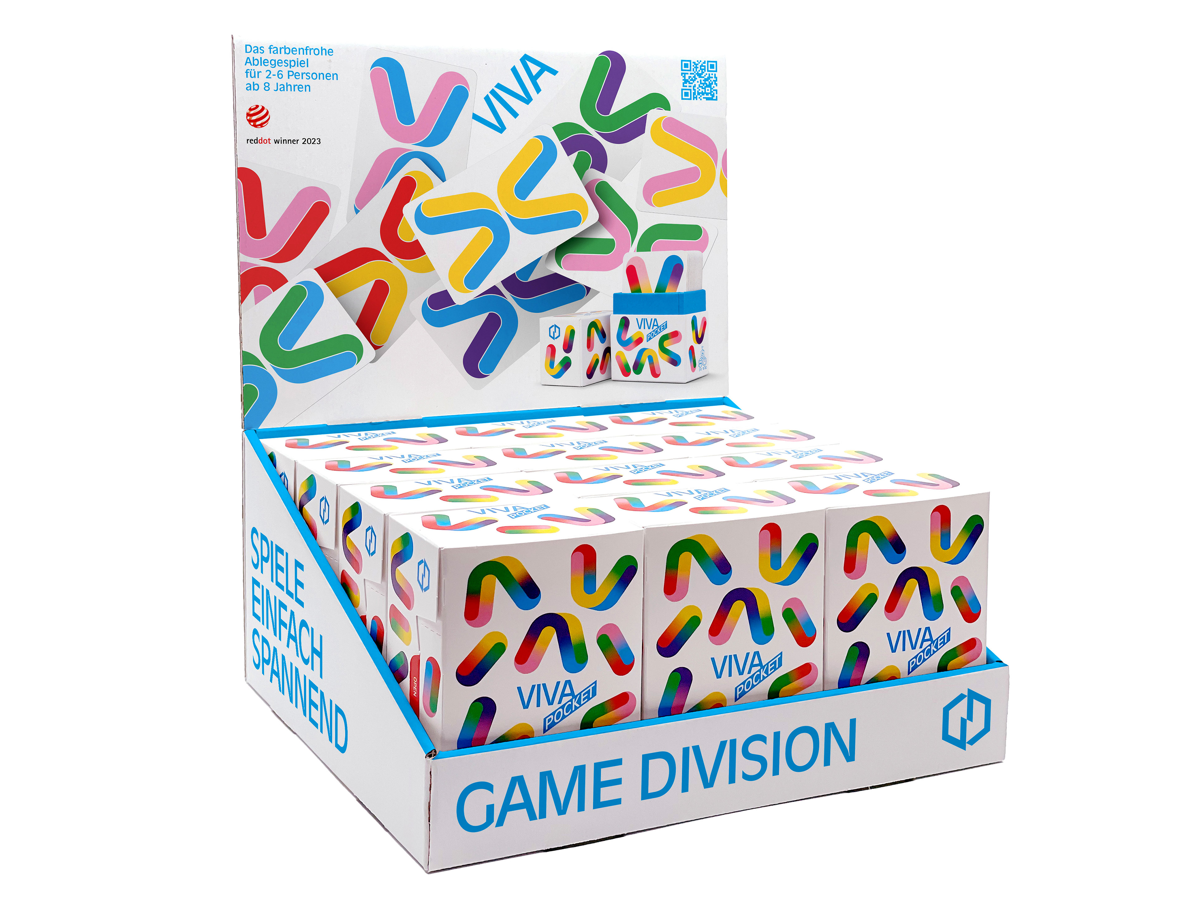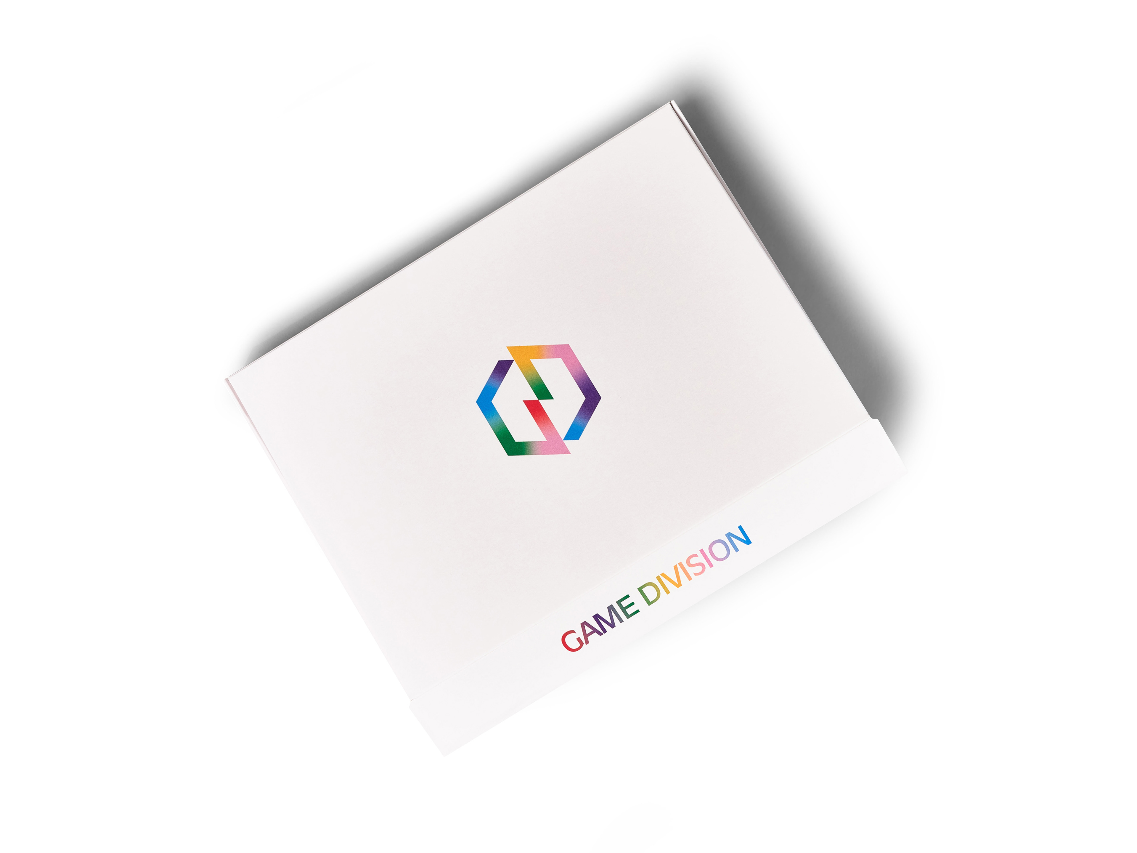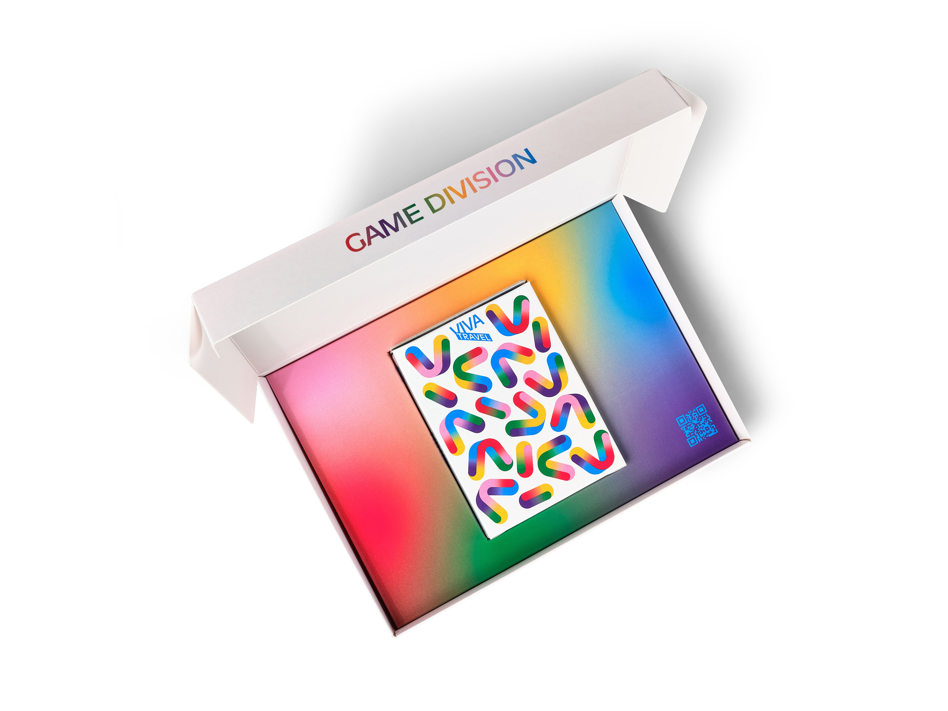 Full design for the third card game published by Game Division. It combines minimalist design with a surprisingly complex game concept. For this, a new brand of its own had to be created within the already existing visual world of Game Division, which can be recognised consistently and instantly. The centrepiece is the design of the game card. Since it must be possible to hold it in the player's hand, the respective colour combination should be immediately visible in all four corners. The two intertwined colours form a V and an A, whereby the name of the game can be derived immediately. This colourfulness of the cards should also be reflected on the packaging and other applications. The implementation with colour gradients raises the basic shape to a new level, making the various adaptations feel very playful but not childish.