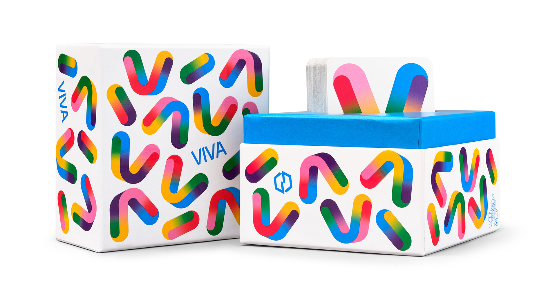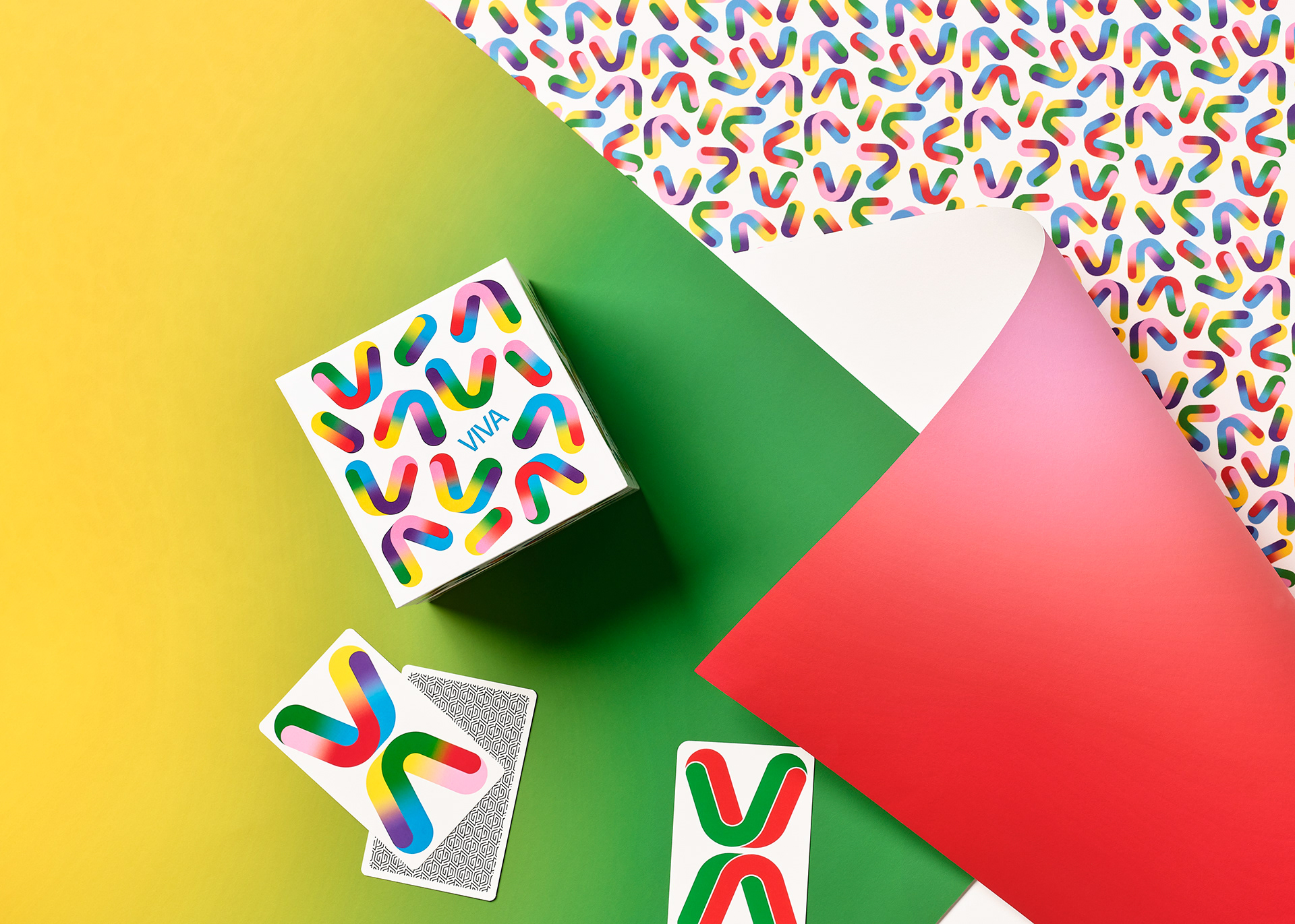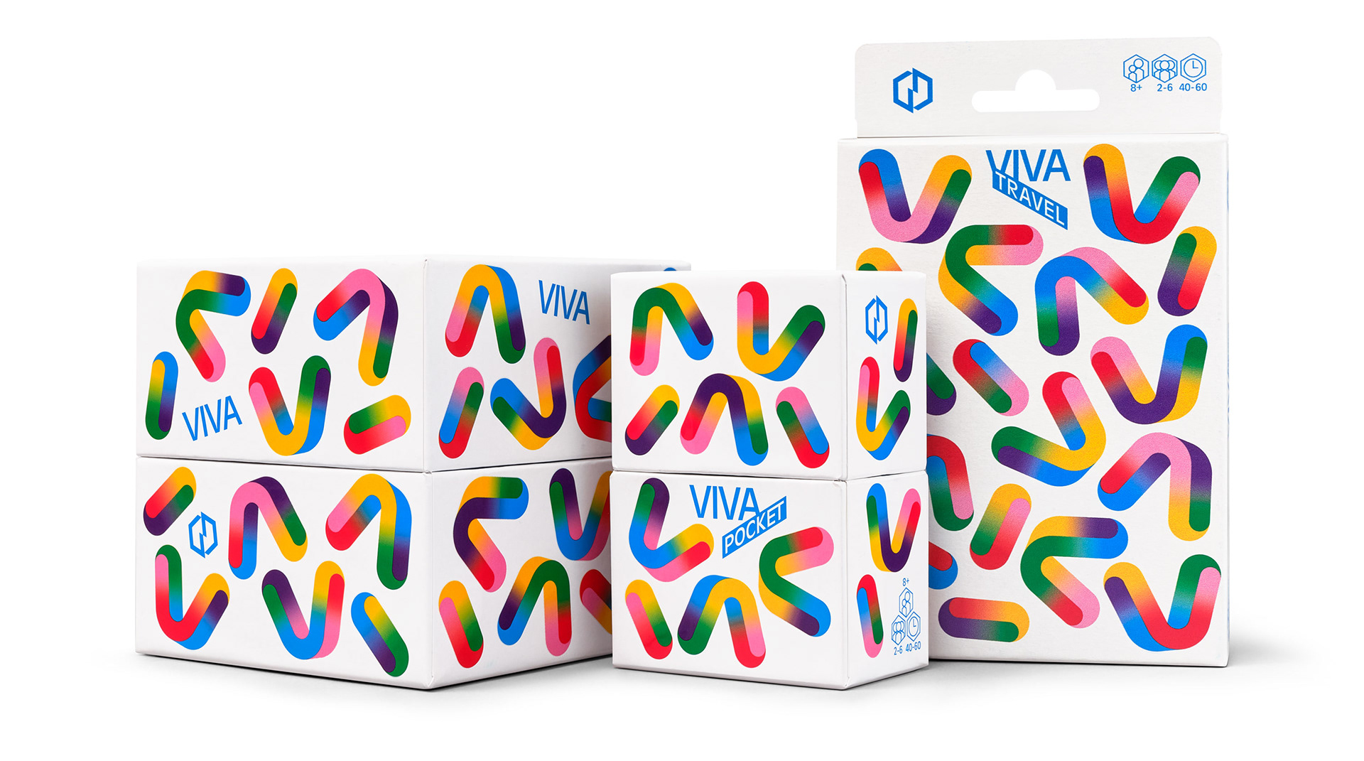 Full design for the third card game published by Game Division. It combines minimalist design with a surprisingly complex game concept. For this, a new brand of its own had to be created within the already existing visual world of Game Division, which can be recognised consistently and instantly. The centrepiece is the design of the game card. Since it must be possible to hold it in the player's hand, the respective colour combination should be immediately visible in all four corners. The two intertwined colours form a V and an A, whereby the name of the game can be derived immediately. This colourfulness of the cards should also be reflected on the packaging and other applications. The implementation with colour gradients raises the basic shape to a new level, making the various adaptations feel very playful but not childish.