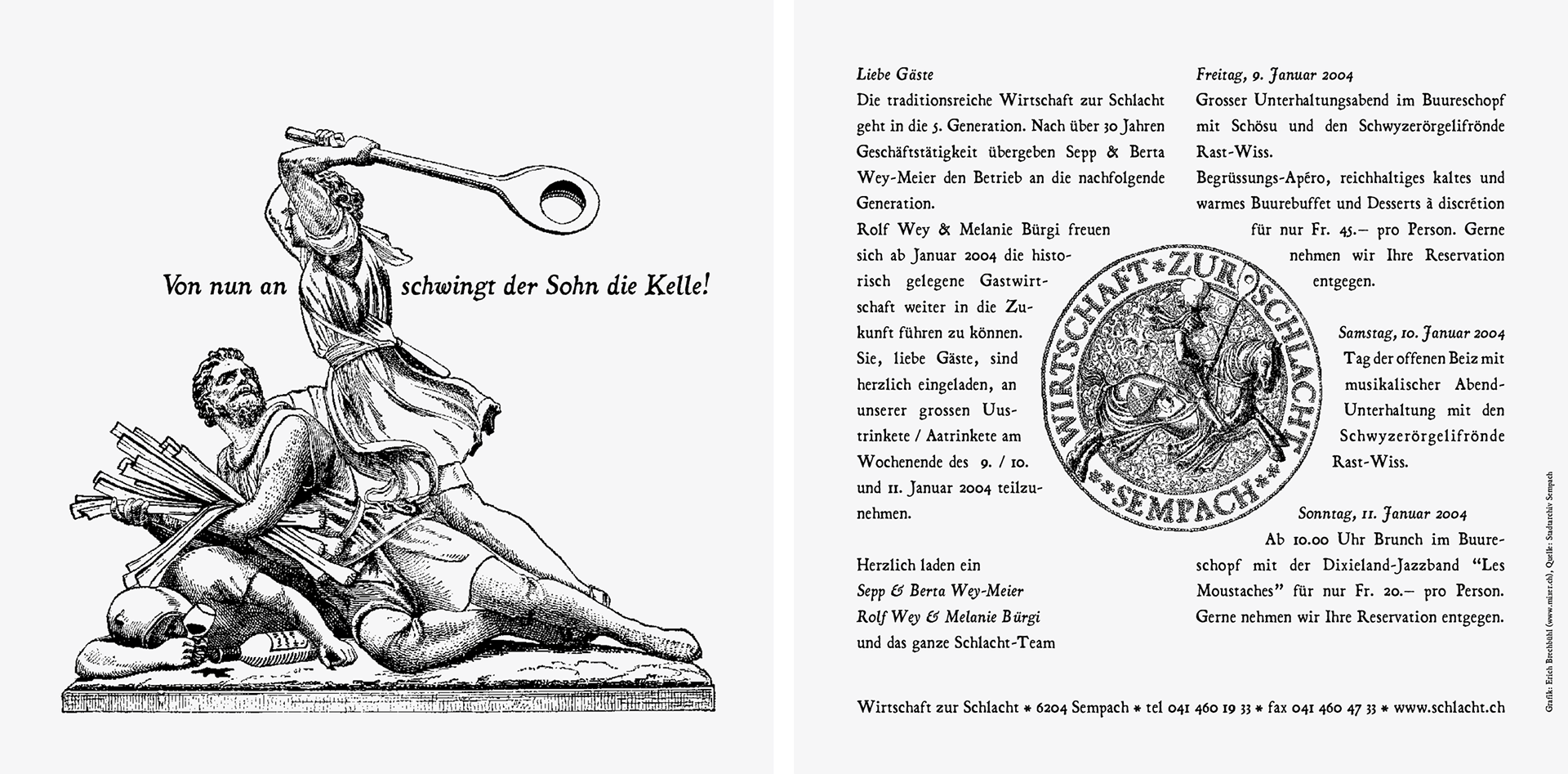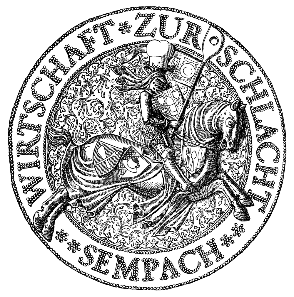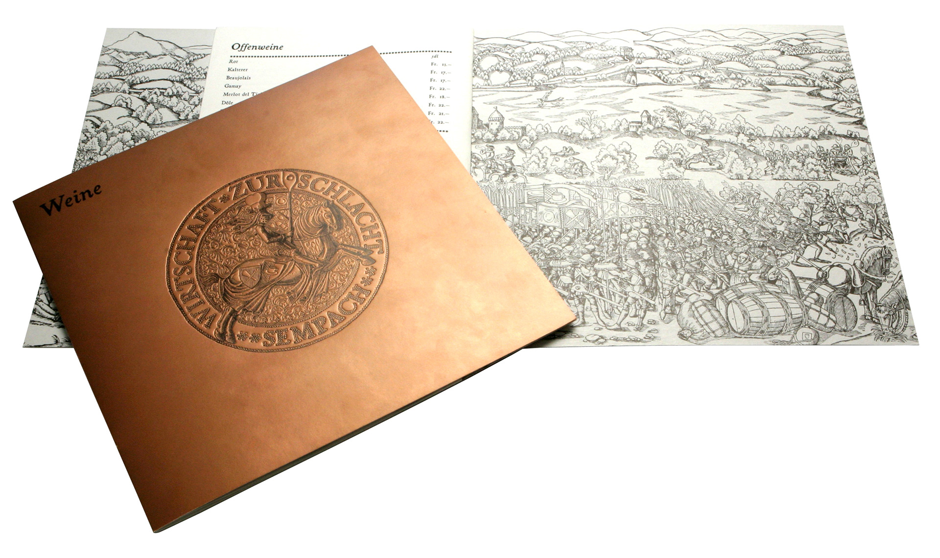 Based on old wood cuts showing the battle of Sempach, I erased all weapons and replaced them with kitchen utilities. With this simple and funny idea it was possible to create a unique design that works only for this restaurant.