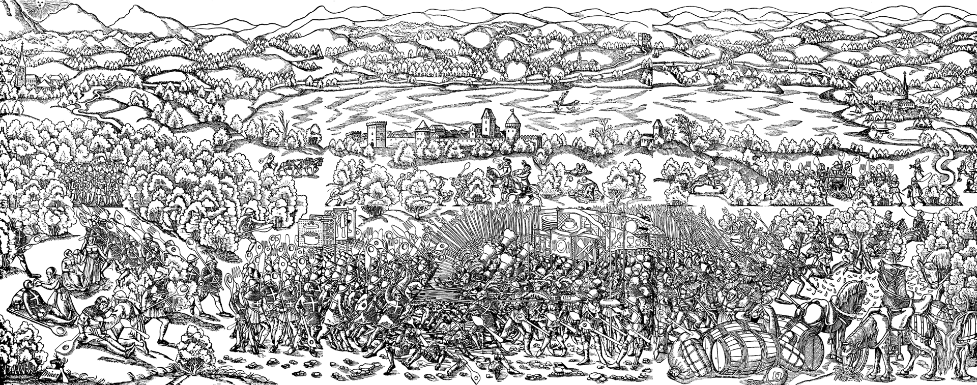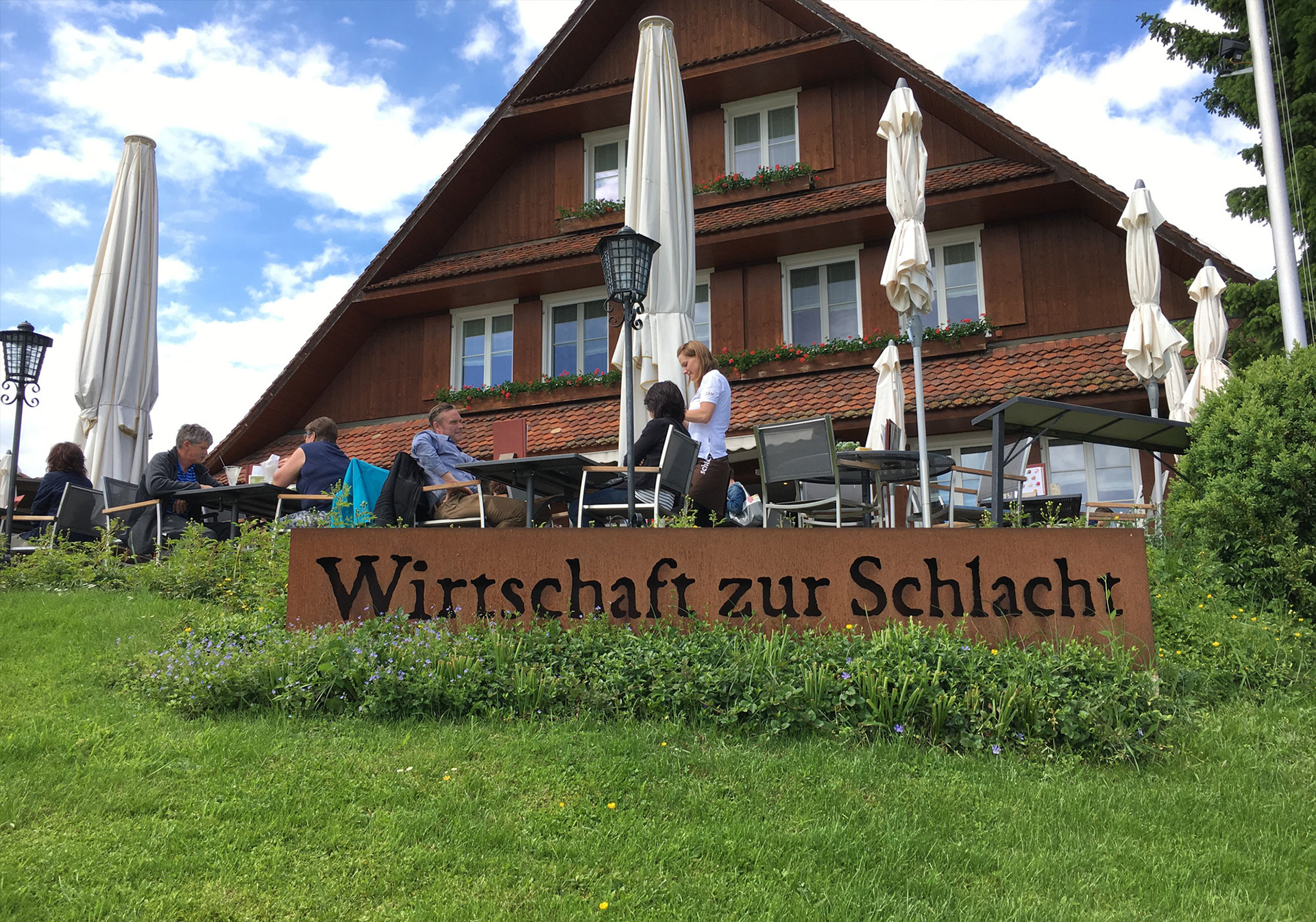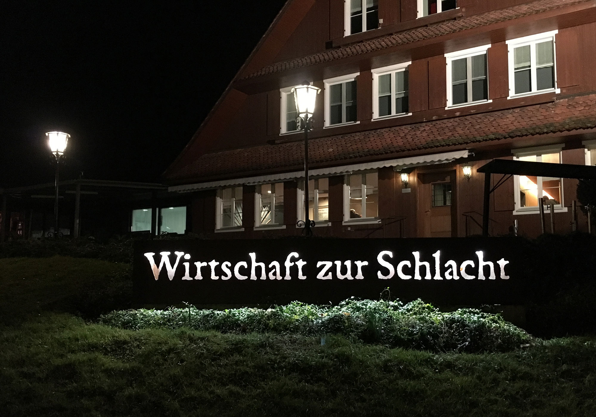 Based on old wood cuts showing the battle of Sempach, I erased all weapons and replaced them with kitchen utilities. With this simple and funny idea it was possible to create a unique design that works only for this restaurant.